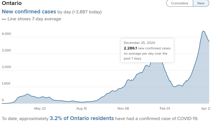 安省公共卫生局公布,过去24小时新增病例3,887例,连续第六天,新增病例少于4,000例,进一步表明安省新增感染病例的数量趋于平稳。