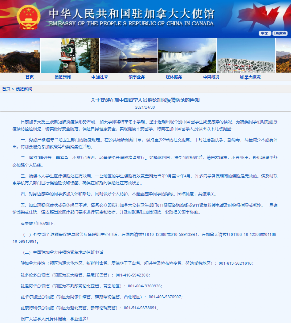 当地时间4月30日,中国驻加拿大大使馆发布《关于提醒在加中国留学人员继续加强疫情防范的通知》,通知全文如下: