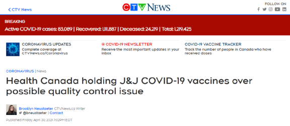 据CBC报道,BC省新冠疫情模型显示,本省已逐渐拉平疫情曲线。可BC省的情况稍稍有所好转,加拿大联邦政府那边又出事了——据CTV News报道,加拿大卫生部30日发布声明称,4月28日运抵加拿大的30万剂强生疫苗目前因质量问题被加拿大卫生部截获,等待进一步调查。