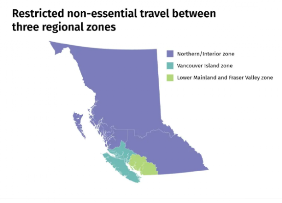 Farnworth在发布会上重申,跨区旅行禁令到5月25日之前不会取消,且警方只会在连接各旅行区的交通干道进行定期的道路检查。跨区的非必要旅行者将被罚款575加元,加拿大皇家骑警(RCMP)预计将会在旅行区边界的1号、3号、5号和99号高速公路路口设置检查点,检查点最快4月30日上线。