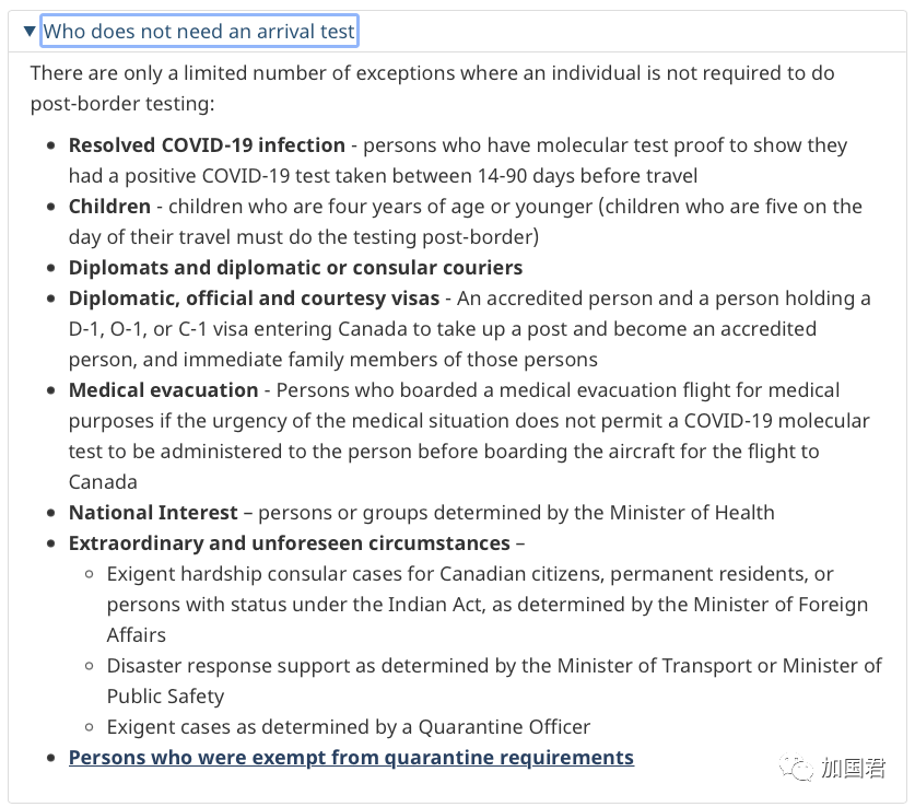 三、已经获得豁免到达测试的人士。根据加拿大卫生部指引,有8类人士不需要进行测试。