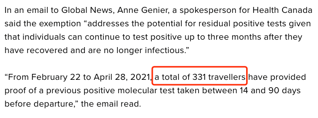 对于媒体的查询,加拿大卫生部发言人安妮•吉尼尔(Anne Genier)回应说,该豁免“解决了残留阳性测试的可能性,因为感染过新冠的患者可以在康复后三个月内体内继续阳性,但不再具有传染性。”