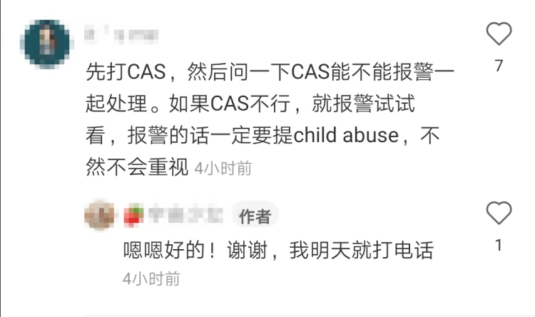 如果CAS不行,还可以报警处理,报警时一定要说明是child abuse,这样才能引起警察重视。