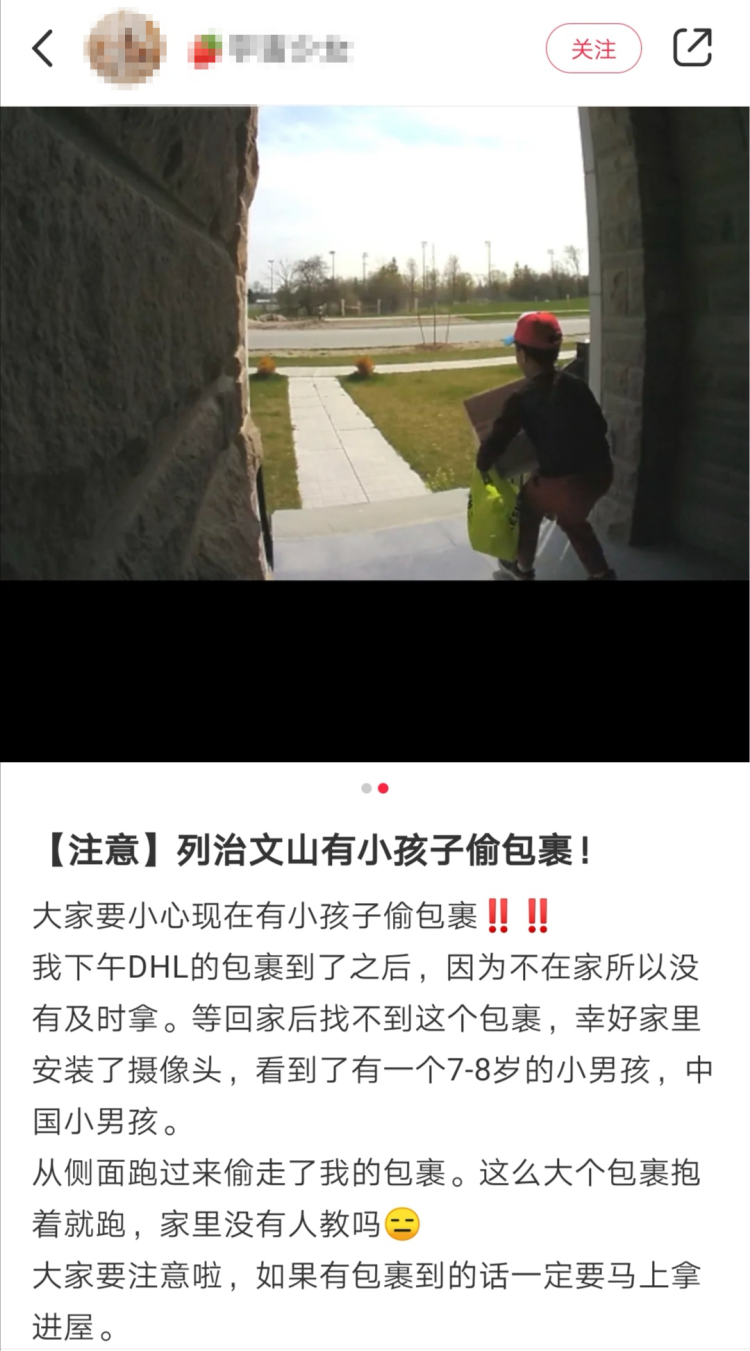 前段时间刚爆出万锦华人大妈开车偷快递,27日,又有网友在小红书上发文称:列治文山有小孩子偷包裹!