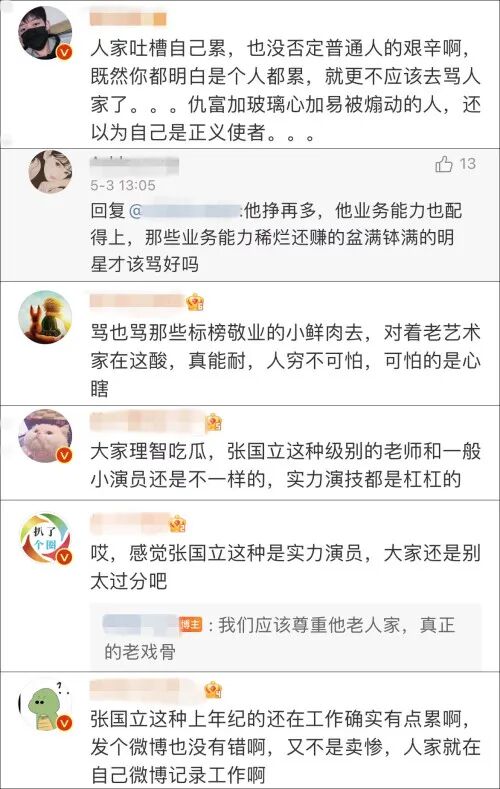这回多了很多粉丝和热心网友来安慰,喊话张国立不用搭理“键盘侠”,认为人们抵制天价片酬应该将矛头对准一些德不配位的流量艺人,而不是来欺负老戏骨。