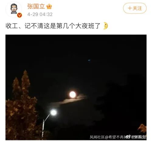 4月29日凌晨4点,这位已经66岁的老演员终于收工,他在个人微博上晒了张“明月当空”,还感慨道“记不清这是第几个大夜班了”。