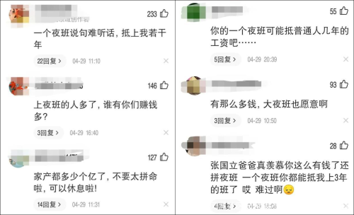 虽然也有暖心留言提醒张国立年纪大了要注意休息,但意外的是,更多的留言是“阴阳怪气”:“一个夜班的酬劳,抵上我若干年,咋这么矫情”“有那么多钱,大夜班我也愿意啊”……