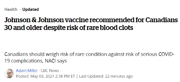 NACI有关强生疫苗的建议几乎与其对阿斯利康疫苗的建议完全相同。背后的原因均为疫苗可能会(在罕见情况下)引发人体血小板缺少症并导致血栓形成。