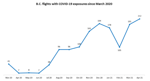 此外,BC省疾控中心4月30日发文称,BC省2021年4月共有212架航班中有旅客感染新冠,再次刷新自疫情开始以来的染疫“毒航班”记录。