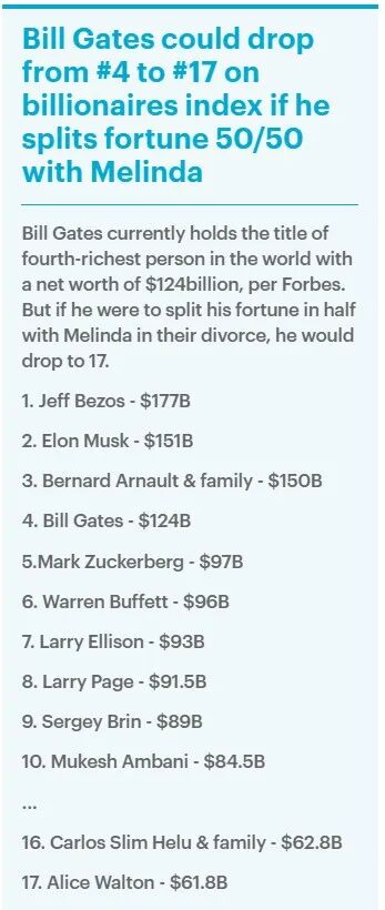 另外有媒体估计,比尔盖茨离婚后的财产将从世界第4,跌落至世界第17。