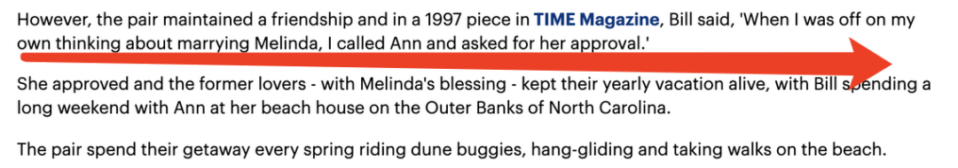 不过激情伴随荷尔蒙起落。三年后的某一天,他们突然分手了。根据《时代》周刊的一篇采访,Ann居然还曾告诉比尔盖茨,说梅琳达“会是他的好搭档,因为她有智力和耐力。”