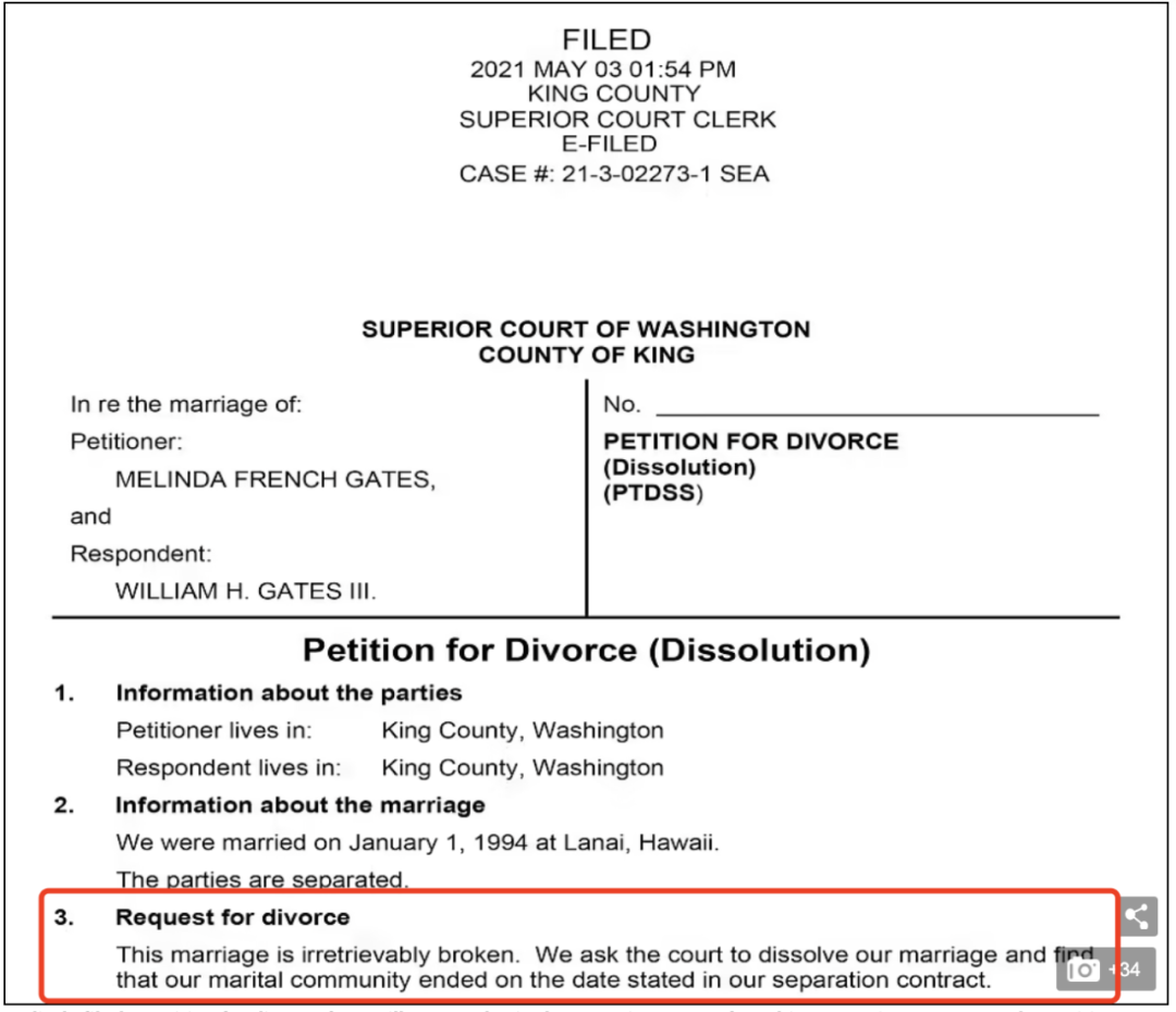 此外,根据梅琳达向美国高等法院提交的离婚申请书,她要求法官“在分居合同所注日期”解除婚姻关系。由于分居合同没包含在这份文件内,所以具体分居日期尚不清楚。