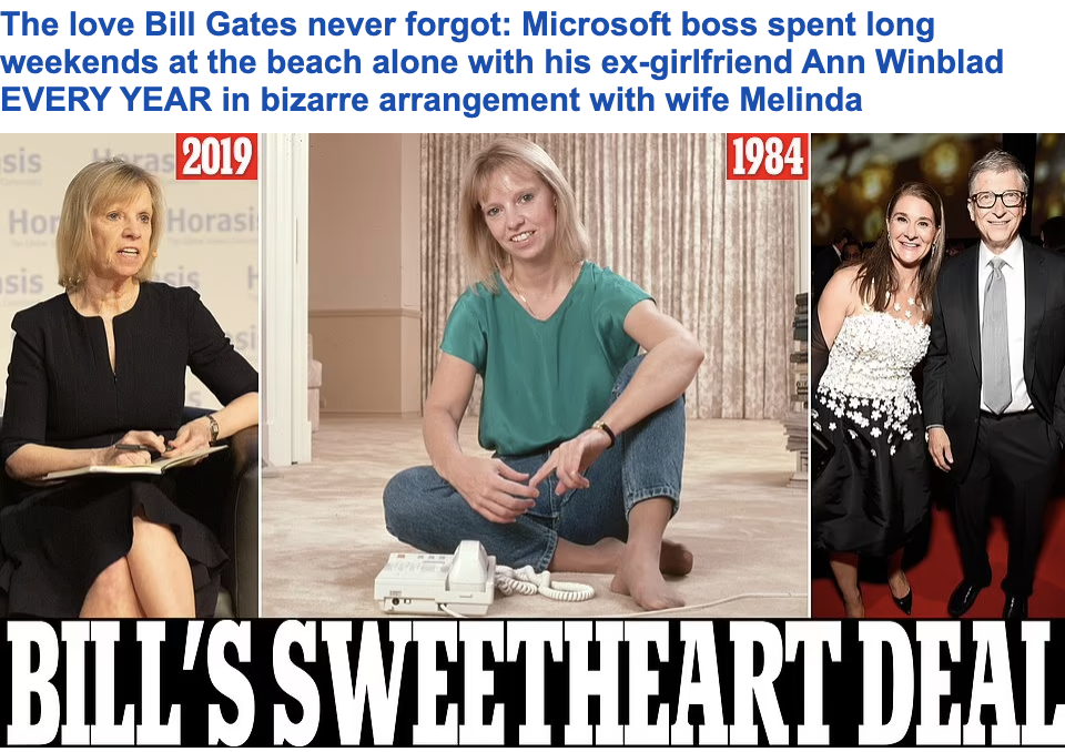 Dailymail报道称,比尔盖茨与梅琳达结婚27载的光阴中,已经默默达成了长达几十年的协议,即允许丈夫比尔盖茨每年与前女友Ann在某处海滩度过一个浪漫的假期。