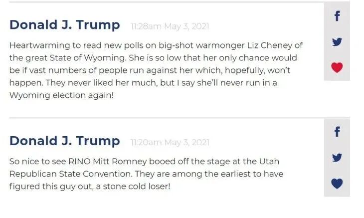 留言板里,上传了特朗普的七八条语录或评论。内容一如既往,就像有网友总结的,基本还是懂王的“老三样”,一是民主党都是蠢货,二是共和党有叛徒,三是美国去年的大选隐藏着“骗局”。