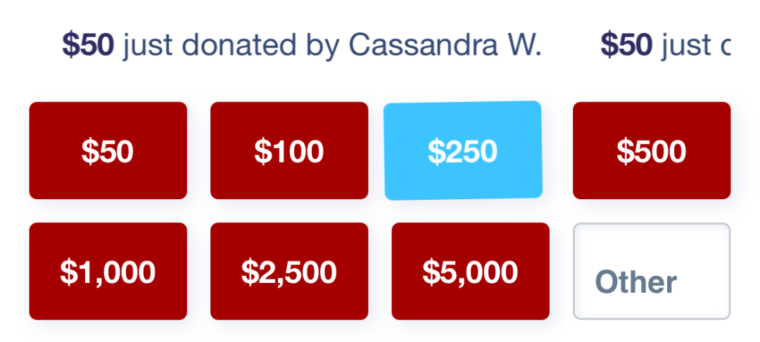贴心的特朗普团队还怕人看不清,错点了50或100美元的捐款按钮,专门把250美元的捐款按钮设计成了蓝色。估计其潜在之意是,你们也别捐太多了,250美元不多不少,正好。