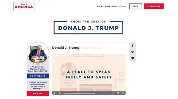 宣传片说,“在这个充斥着沉默和谎言的时代,一座自由灯塔冉冉升起;一个可以自由和安全表达的平台,将从特朗普的书桌开始起航。”网站左上角还有一条宣传口号——“拯救美国(Save America)”。