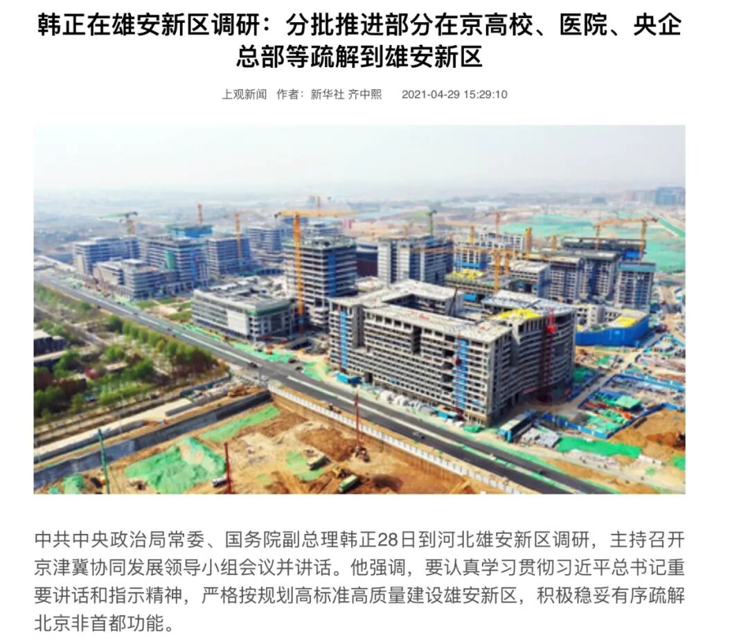 新华社消息,政治局常委、国务院副总理韩正28日到河北雄安新区调研,调研工作包括“分批推进部分在京高校、医院、央企总部等疏解到雄安新区。”
