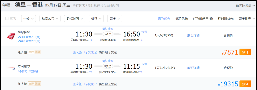 德里飞香港的航班,到了5月19日相对的低价,也要7871元,约合1215美元。