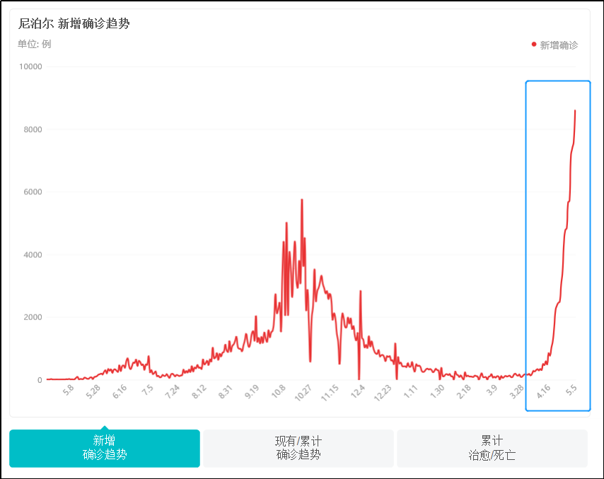 尼泊尔新增病例在4月以来猛增,人心惶惶。