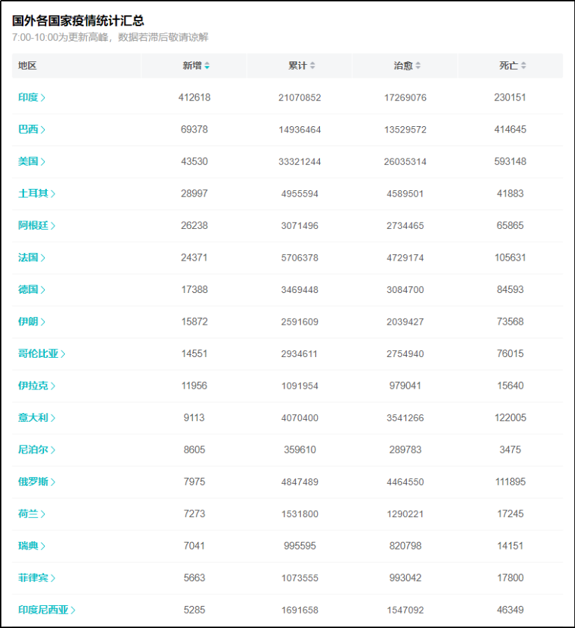 同样可怕的是,现在还有10个国家每日新增病例过万,还有7个国家每日新增病例过五千。