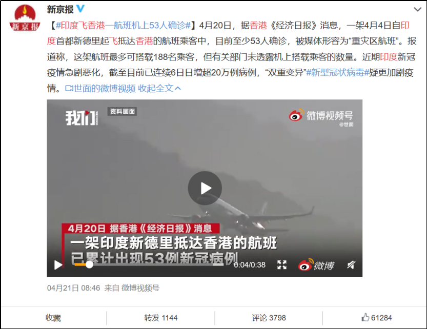 4月,有一架飞机从印度飞往中国香港,登机前所有乘客的核酸检测都呈阴性,落地后却至少有53人确诊感染,据推测该航班上总共可能有188名乘客。