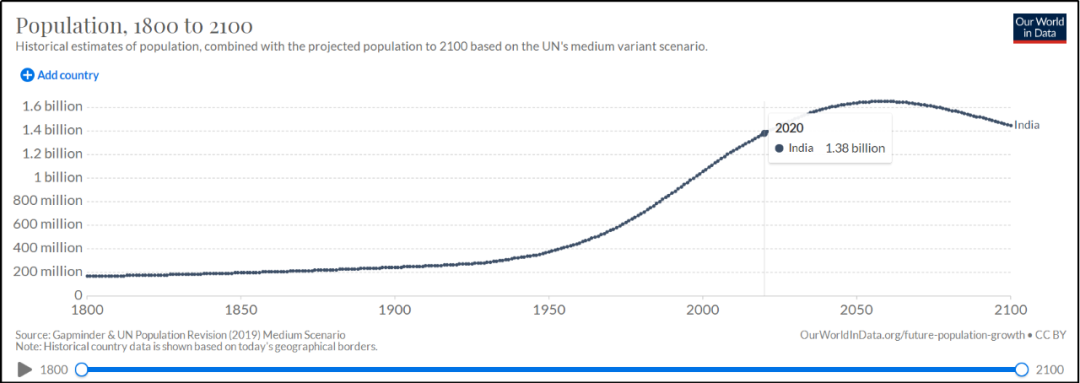 “OurWorldinData”根据联合国相关数据测算,印度2020年人口有13.8亿,并在2060年左右达到16.5亿的峰值。