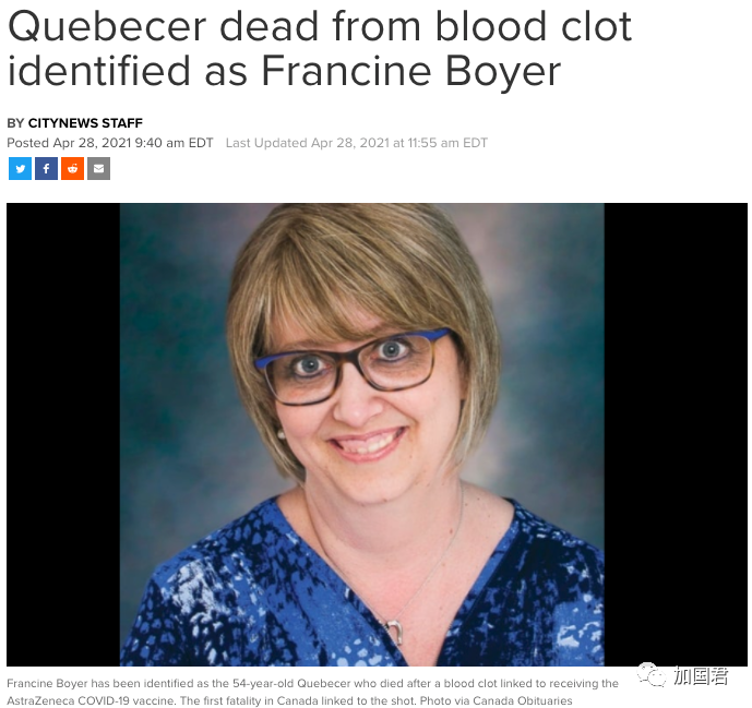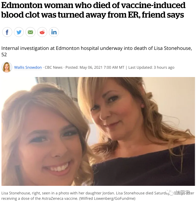 加拿大女子接种疫苗后头痛呕吐!急诊被拒!第2天血栓去世2021-05-07 |作者: | 来源:加国君加拿大新冠Loading...分享:#加拿大#新冠#血栓#阿斯利康疫苗 加拿大一名52岁女子接种阿斯利康疫苗后感到不适,到医院急症室求医被拒,2天后血栓反应而去世。 图:血栓死亡的斯通豪斯(右)和女儿合照 阿尔伯塔省卫生部首席医疗官Deena Hinshaw博士周二表示,一名50多岁的妇女在接受阿斯利康疫苗后死于疫苗诱导的免疫性血小板减少症(VITT)。 官方一直没有透露这名受害者女子的身份,但家人确认,死者是52岁的丽莎·斯通豪斯(Lisa Stonehouse),住在埃德蒙顿市。 死者朋友威尔弗雷德·洛文伯格(Wilfred Lowenberg)说,斯通豪斯4月29日身体感觉不适,到当地一间Grey Nuns Community Hospital医院急症室求医被拒,没能住院,2天后,她被送入Strathcona医院,后来因为确诊脑部有血块而被转移到阿尔伯塔大学医院,最后于上周六在阿尔伯塔医院去世。 好友洛文伯格说,斯通豪斯于4月21日接种阿斯利康疫苗,当时,斯通豪斯几乎立即感到僵硬和不舒服。 随后几天,她感到越来越不适,并出现了难以忍受的头痛。 洛文伯格说,4月29日星期四,随着症状的恶化,她打电话给Health Link,但被告知,这可能是正常的疫苗反应。 当天晚些时候,19岁女儿开车送母亲到埃德蒙顿东南部的Grey Nuns 医院的急诊室。 斯通豪斯的头部疼到噗噗地颤动,身体非常虚弱,并且不断呕吐。 但是,急诊室5分钟将斯通豪斯打发回家休息,说是正常现象,吃泰诺就可以。 第二天4月30日,女儿看到母亲越来越差,于是再次开车送她到急诊室,这次换了家医院,去Sherwood Park的Strathcona医院。 这次,医院收下斯通豪斯,但已经太晚了。 CT扫描显示,斯通豪斯已经形成血栓,引发了致命的脑出血。 洛恩伯格说,斯通豪斯被转移到阿尔伯塔大学医院,但在救护车中,她癫痫发作并被插管。 第二天,4月30日星期六,斯通豪斯被剥夺了生命支持。 斯通豪斯成为加拿大第二例阿斯利康血栓死亡的受害者,目前加拿大共有3例AZ血栓死亡案件。 其中第一例的魁省54岁弗朗辛·博耶(Francine Boyer)4月9日接种了阿斯利康疫苗,在随后的几天里,妻子开始出现头痛和严重的疲劳感,4月23日死于脑血栓。 回顾:妻子接种AZ后血栓去世!丈夫伤心!特鲁多再次保证疫苗安全 劳恩伯格说,受害者家庭想知道为什么斯通豪斯在初次到Grey Nuns 医院急诊时被拒。 女儿想知道,延误的12小时是否导致了母亲的死亡。 Covenant Health在周三的一份声明中说,内部调查正在进行中。 声明说:“在这个困难的时刻,我们向受害者家人和亲人表示最深切的慰问。” “ Covenant Health与Alberta Health Services合作,正在积极调查围绕受害者访问急诊室的所有情况,并向我们的家人保证我们正在调查他们的担忧。” 19岁的女儿乔丹(Jordan)现在失去了双亲,父亲于2019年1月莫里因脑动脉瘤去世。 去年,大流行爆发,一整年都在家,母亲斯通豪斯于是制定了宏伟的生活计划。 她想和女儿一起环游世界, 她想和女儿去重游和父亲去过的所有地方, 她想和女儿一起度过一生,享受生活。 这也是她尽快接种疫苗的唯一原因。 可惜,医院急诊室的一次拒绝接收,让一名19岁女儿在母亲节要悼念刚刚逝去的母亲。 阅读 未经允许不得转载:加拿大乐活网 »加拿大女子接种疫苗后头痛呕吐!急诊被拒!第2天血栓去世分享: