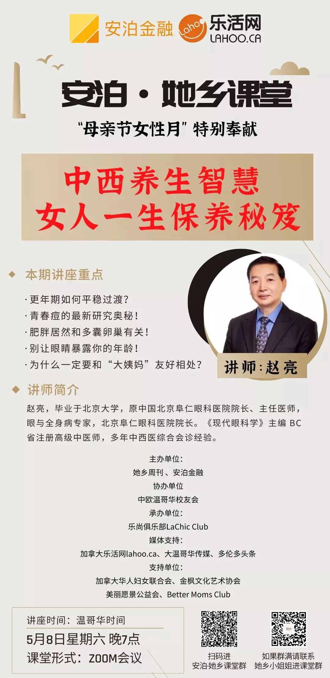 本次讲座特别邀请到毕业于北京大学的眼与全身病专家、BC省注册高级中医师赵亮医师,由他为大家带来一系列的讲座重点,包括:更年期如何平稳过渡?青春痘的最新研究奥秘;别让眼睛暴露你的年龄;以及为什么要和“大姨妈”友好相处、活出好状态等等,干货满满。不仅仅是针对妈妈,各个年龄段的女性都能在这次讲座中收获颇丰。