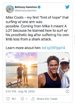 在康复期间,贝瑟妮认识了迈克·库茨,迈克同样是一个冲浪选手,同样,他的腿也被鲨鱼咬断了。跟迈克的相识极大的鼓励了贝瑟妮,他告诉贝瑟妮,自己是如何靠假肢重新站上冲浪板,重新冲向大海的。贝瑟妮感到生活重新燃起了希望。