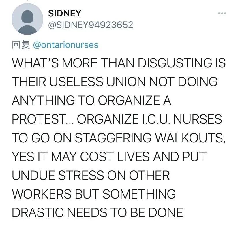 “只抗议啥也不做没有用!应该组织护士大罢工!虽然这可能会付出生命的代价,但他们(省政府)就是需要被下点猛药。”