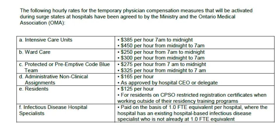 安省的医生在疫情之下获得了省政府特批的“疫情补助”。根据补助标准,早上7点到午夜,在ICU值班的医生能拿到每小时385刀的补助;而从午夜值班到早上7点,每小时能拿到450刀的补助。(值个夜班赚3150刀,16712人民币,一晚一个包,一晚一个包)
