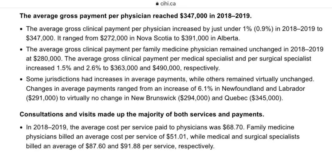 CIHI加拿大卫生信息研究所(Canadian Institute for Health Information)的数据显示:在2018到2019年间,加拿大注册医师的平均年薪为34万7000刀,相当于184万元人民币。