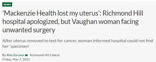 她找到媒体公开,希望人们知道,列市医院麦肯齐健康中心(Mackenzie Health)犯了错,并警告患者们要小心。
