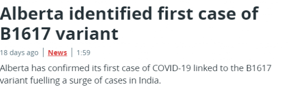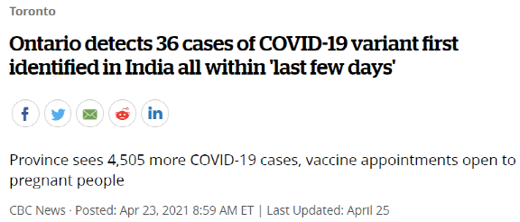 4月23日,安大略省累计已发现36例印度变种病毒病例;虽然来自印度的航班被禁了,阿尔伯塔省发现该省第一例印度变种。