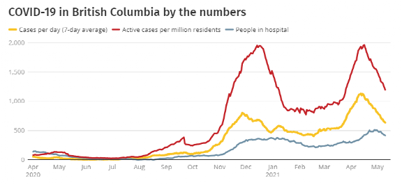 目前已有超过200万BC省民接种了第一剂新冠疫苗,自5月7日以来,活跃病例与医院收治人数目前已分别下降6.7%与9.1%。