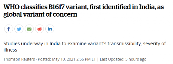 【加拿大乐活网lahoo.ca 程序综述】世界卫生组织(WHO)5月10日将源于印度的三重变种新冠病毒(B.1.617)列为“全球健康风险(Global Health Risk)”。该组织负责研究新冠病毒的技术负责人Maria Van Kerkhove表示,目前已有一些证据表明,该变种可致现有新冠疫苗无效。