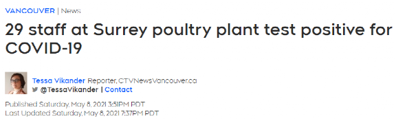 据CTV News 5月8日报道,菲莎卫生局称,大温素里一家位于13542 73A Avenue的禽肉处理厂突然暴发新冠疫情,该厂已有29名员工新冠测试呈阳性。对此,BC省公共卫生厅7日已对该厂下达了为期10天的关门令。