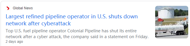 5月7日,受黑客侵袭美国东部最大的燃油输送管线被迫关停。当地时间5月9日,美国宣布进入国家紧急状态,原因是当地最大燃油管道运营商遭网络攻击下线。美国最大的成品油管道运营商Colonial Pipeline在因受到勒索软件攻击,被迫关闭其美国东部沿海各州供油的关键燃油网络。