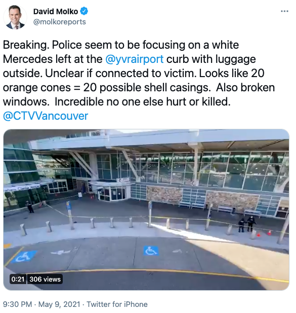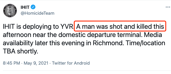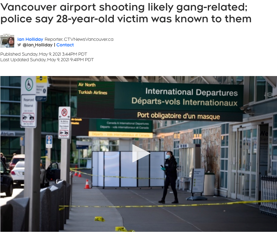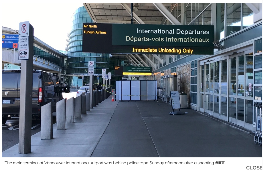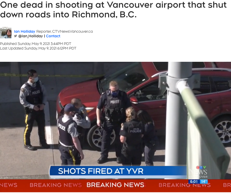 5月9日下午3时,温哥华列治文国际机场的候机楼外发生一宗枪击案,一名男子中枪身亡,警方凶杀组到场行调查。