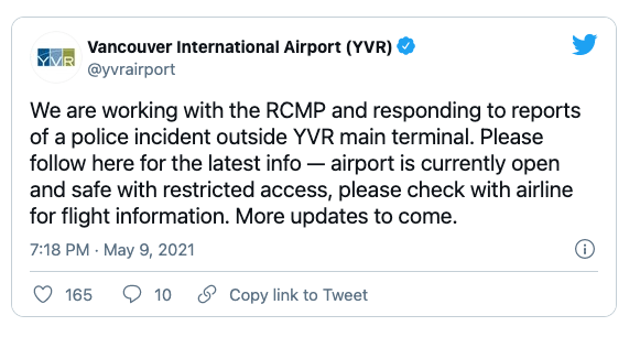 温哥华机场管理局在一份声明中说,加拿大皇家骑警于周日下午在航站楼外对这一事件作出了回应,但将所有其他问题转交给了警方。