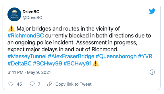 根据DriveBC的报道,由于周日下午发生的枪击事件,通往列治文的Massey隧道和其他主要道路也被禁止通行。这些交通干道已于5月9日下午4时许尽数开放。