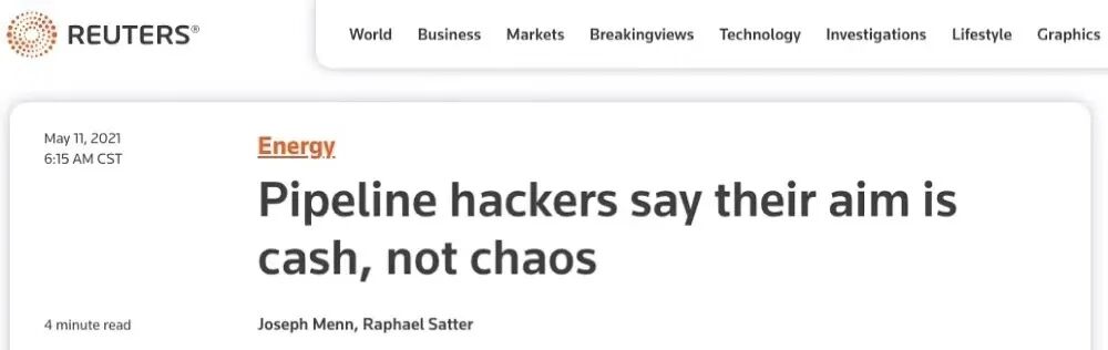 报道称,“黑暗面”在其官网发布的简短新闻稿“关于最近的新闻”并没有提及Colonial Pipeline,只是在内文中写道:“我们的目的是要钱,而不是为社会制造麻烦”。