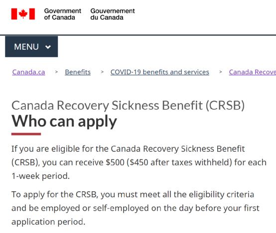 根据加拿大联邦政府的规定,只有当雇员的工作量少于每周正常工作量的50%时,他/她才有资格申请CRSB福利金。这项福利金将为有资格申领的上班族提供每周500加元(税后为450加元)的现金。