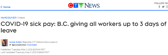 据CTV News 5月11日报道,BC省政府当日提交了《就业标准法》(Employment Standard Act)的修正案,要求省内所有雇主给那些出现新冠症状的、因染上新冠必须自我隔离的、以及正在等待新冠检测结果的员工最高3天的带薪病假。