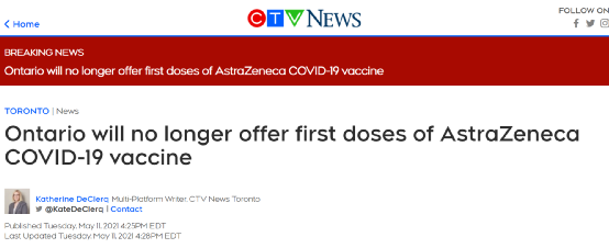 CTV News 5月11日报道,安大略省首席医疗官David Williams称,鉴于该省有越来越多的省民在接种完阿斯利康疫苗后体内出现血栓,安大略省即日起将不再为省民接种第一针阿斯利康疫苗。