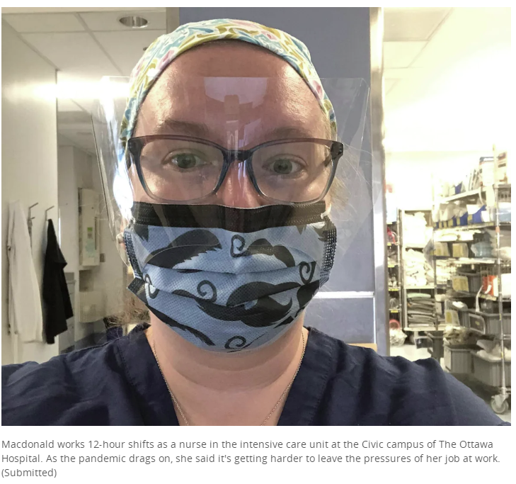 MacDonald女士是渥太华一家医院重症监护室的护士,她已经工作了17年,现在她每天工作12小时,她最近感受到了因为疫情所给她的前所未有的压力。