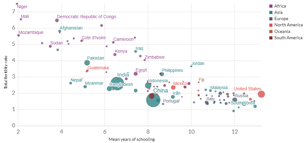 生育率与平均受教育年限(来源:ourworldindata.org)