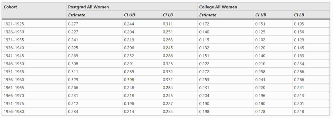 受过研究生教育的女性和受过大学教育的女性之间的无子女水平差别很大。在1956-60年出生的女性中,接受过研究生教育的女性有三分之一没有子女。在1951-60年的大学毕业生中,无子女的比例也上升到最高水平(25-27%)。
