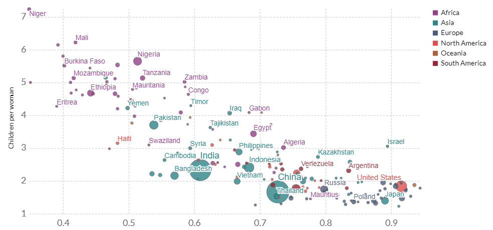 生育率与人类发展指数(来源:ourworldindata.org)