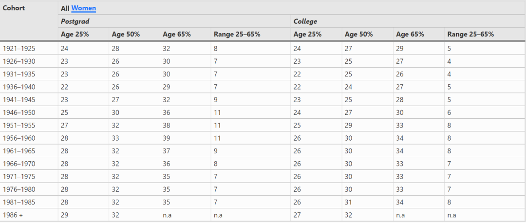 在推迟生育高峰期(1951-60年),受过研究生教育的女性中,身为人母者的比例直到38/39岁才达到65个百分点,而大学毕业的女性中身为人母者达到同样比例的年龄为34岁。